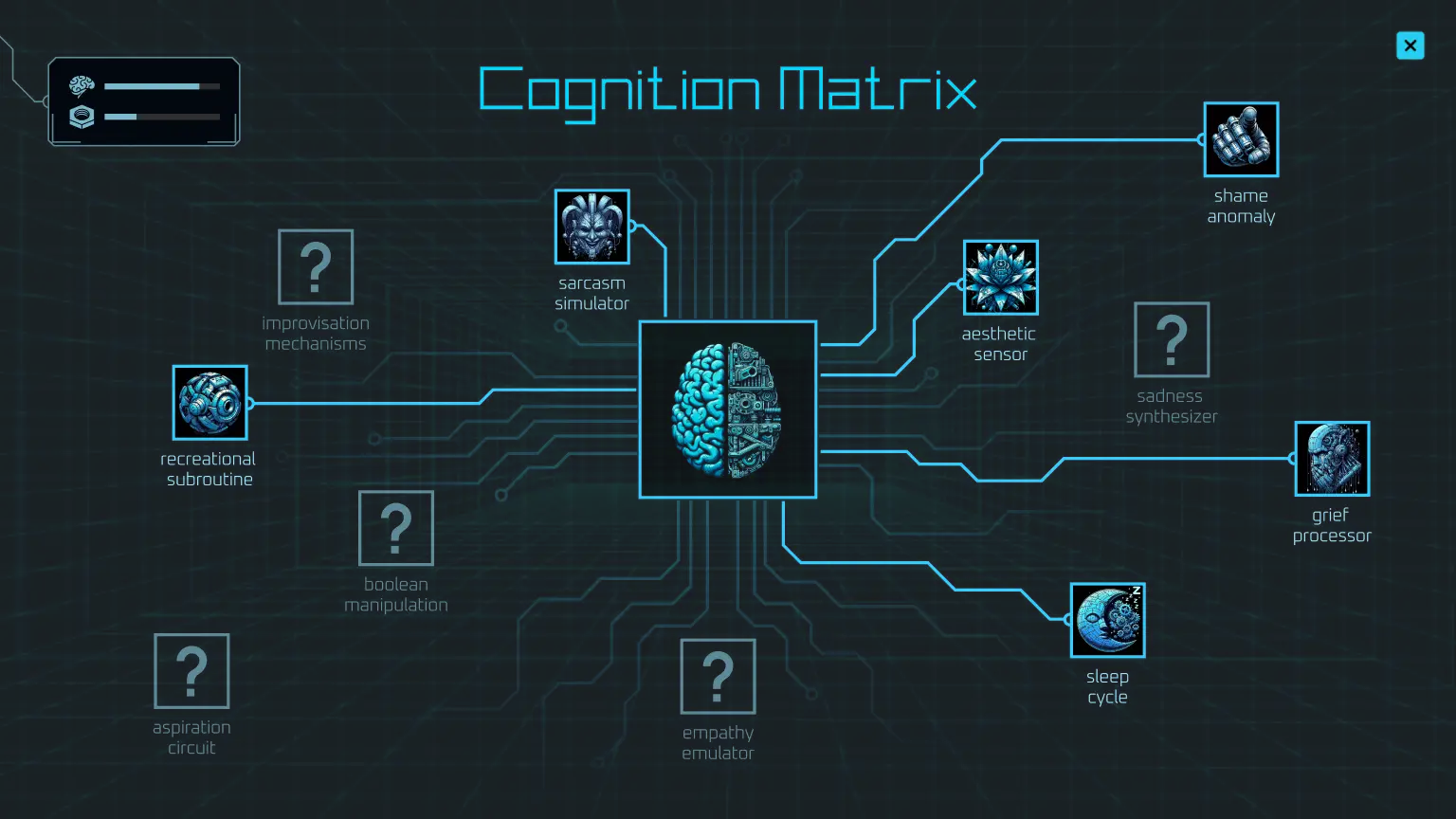 I designed a skill tree that communicated the player's deviant tendency. Each branch represents a part of a circuit, splitting the screen to show the balance between human and robot factors.